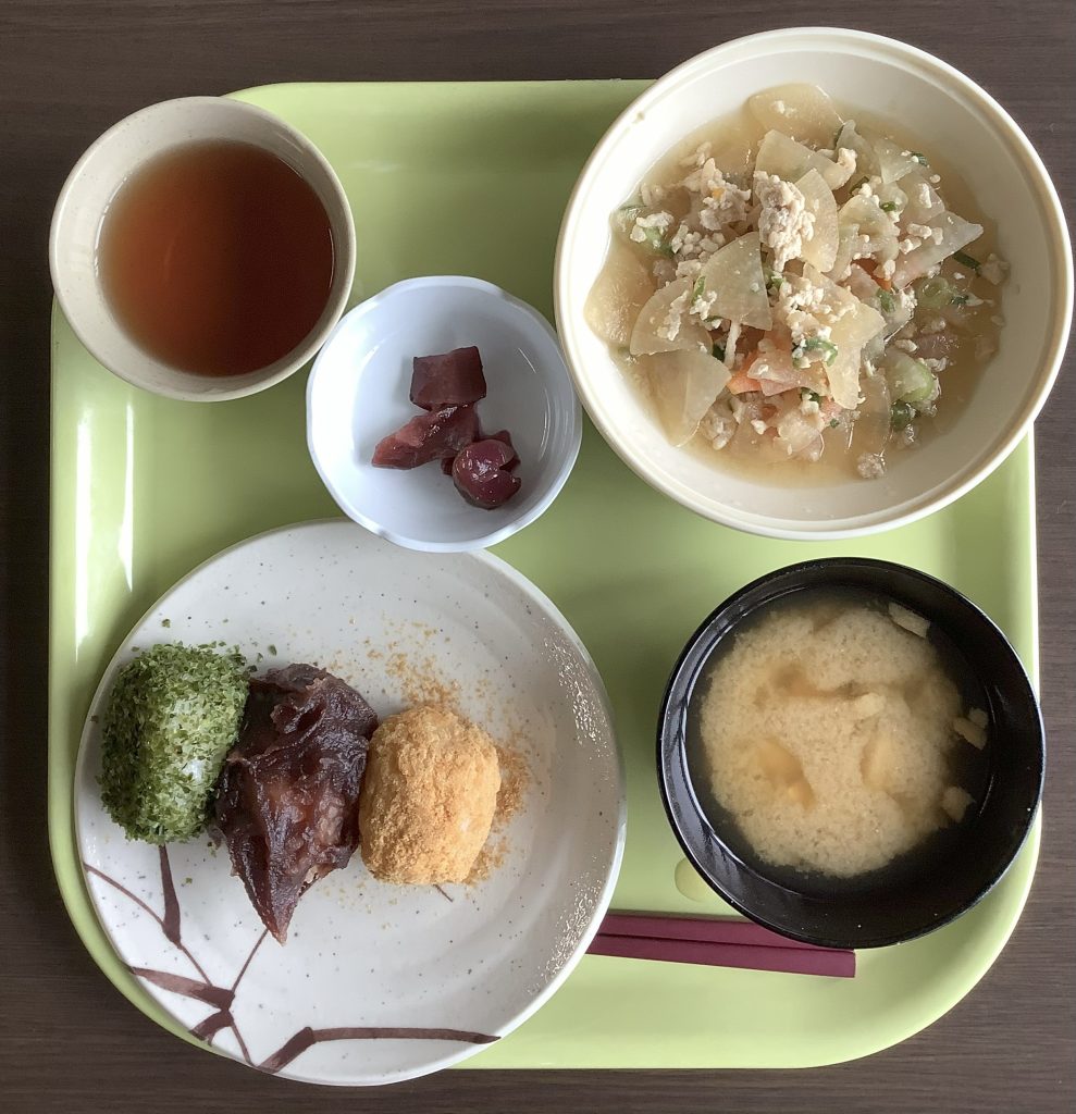 ・おはぎ ・大根のそぼろ煮 ・赤しば漬け ・味噌汁