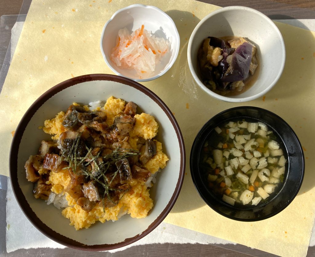 ・うなぎ丼 ・揚げなすのサラダ ・大根なます ・お吸い物