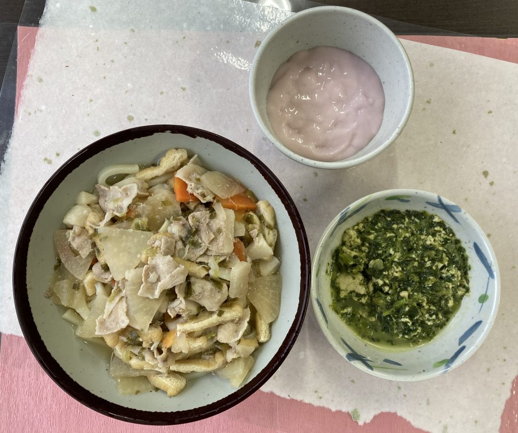 季節の野菜や油揚げを煮込んだ温かい具だくさんの汁を、ゆでたうどんにかけて食べる料理です。